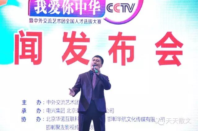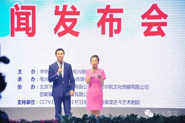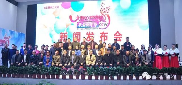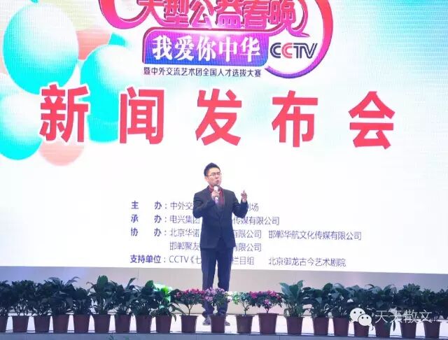 11月18日,魏县电兴剧场门前彩球飞舞、彩带飘扬,剧场内高朋满坐、谈笑风声。由中外交流艺术团主办,电兴集团承办的“我爱你中华”大型公益春节联欢晚会暨中外交流艺术团人才选拔大赛走进魏县新闻发布会,在这里隆重举行。中央电视台11频道主持人赵保乐、中央电视台证券资讯频道主持人李燕、全国少儿春晚主持人张恒昌共同主持了新闻发布会。CCTV《七彩梨园》栏目组总制片人丁梅,中外交流艺术团团长、CCTV少儿春晚导演、此公益春晚总导演田军,电兴集团总裁、此公益春晚总制片人闫廷,国家一级演员、电视剧《西游记》沙僧扮演着者刘大刚等和我国文化艺术界许多老领导、专家、学者、演员及来自全国的多家媒体记者共有600多人参加了新闻发布会。