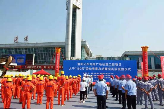 图为日前在洛阳火车站南广场改造工程举行大干150天授旗启动仪式。
