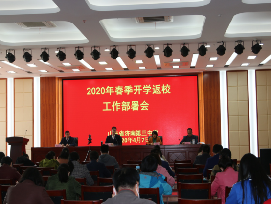 4月7日,济南三中两校区召开2020年春季开学返校暨校园疫情防控工作视频会,贯彻落实省、市春季开学工作会议精神,安排部署春季开学相关工作。两校区全体干部职员和高三教师以及高一高二学部抽调到高三任教的老师参加会议。