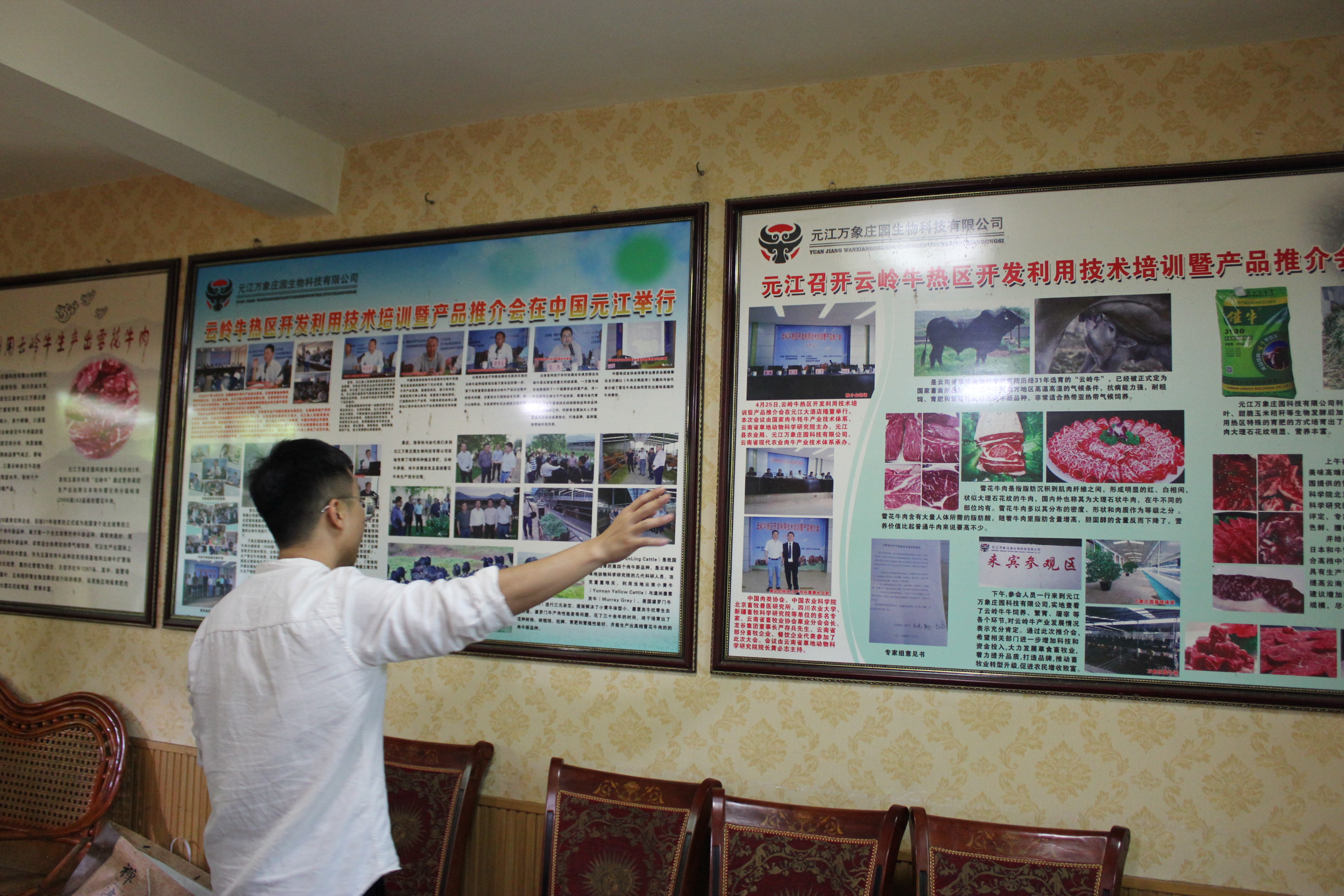 通过介绍,了解到公司目前以生态科学养殖为宗旨,以规模化养殖、产业化经营、集约化管理为理念,利用热带经济作物副产品甘蔗稍、香蕉叶、玉米秸秆等生物发酵后的饲料进行科学喂养,采用热区特殊育肥的方式,培育出了“云岭雪花牛,并生产优质、无公害牛肉食品及相关深加工产品,开创了云南养牛新模式。